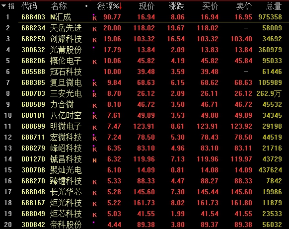 换手率前五个股为:汇成股份、浩瀚深度、路维光电、智微智能、泰祥股份,分别为84.095%、69.091%、63.293%、58.256%、57.951%。
