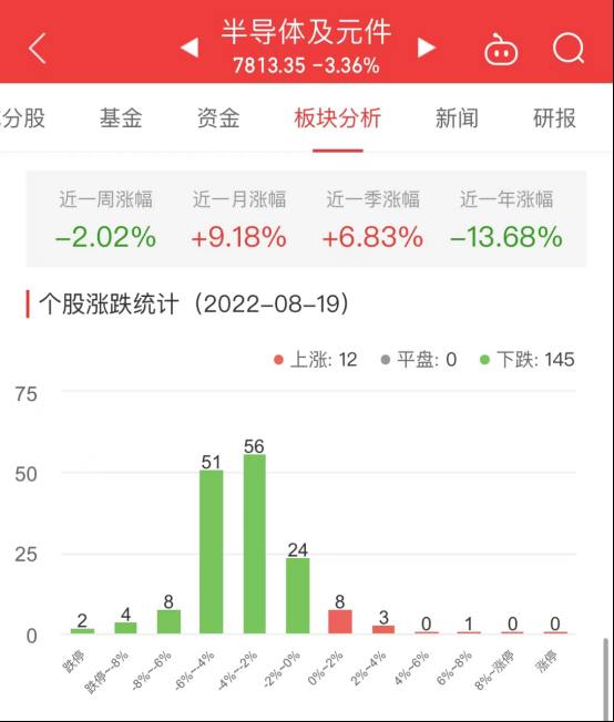 中国经济网北京8月19日讯 今日,半导体及元件板块整体跌幅3.36%,其中12只股票上涨,145只股票下跌。
