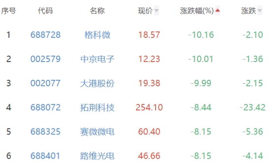 格科微、中京电子(002579)、大港股份(002077)、拓荆科技、赛微微电、路维光电位列涨幅榜后六位,涨幅分别为-10.16%、-10.01%、-9.99%、-8.44%、-8.15%、-8.15%。