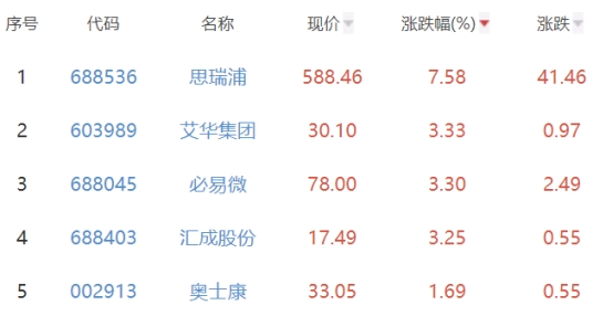 其中,思瑞浦、艾华集团(603989)、必易微、汇成股份、奥士康(002913)位列板块涨幅前五位,涨幅分别为7.58%、3.33%、3.30%、3.25%、1.69%。