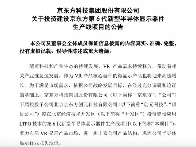 【TechWeb】10月30日消息,今日下午,京东方A发布公告称,公司下属控股子公司北京京东方创元科技(000551)有限公司拟在北京经济技术开发区投资建设应用 LTPO 技术的第 6 代新型半导体显示器件生产线项目, 着力布局 VR 显示产品市场,进一步丰富公司产品结构,巩固公司半导体 显示行业龙头地位。