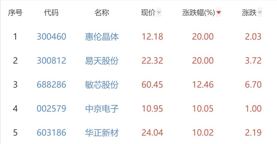 其中,惠伦晶体(300460)、易天股份、敏芯股份、中京电子(002579)、华正新材(603186)位列板块涨幅前五位,涨幅分别为20.00%、20.00%、12.46%、10.05%、10.02%。