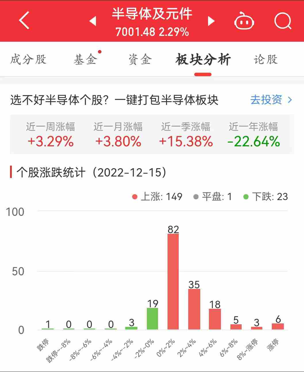 中国经济网北京12月15日讯 今日,半导体及元件板块整体涨幅2.29%,其中149只股票上涨,1只股票平盘,23只股票下跌。