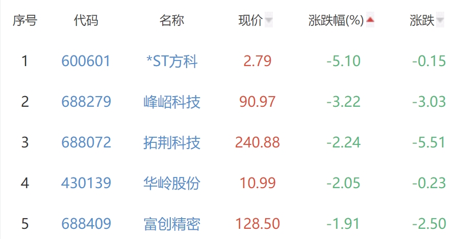 *ST方科、峰岹科技、拓荆科技、华岭股份、富创精密位列涨幅榜后五位,涨幅分别为-5.10%、-3.22%、-2.24%、-2.05%、-1.91%。