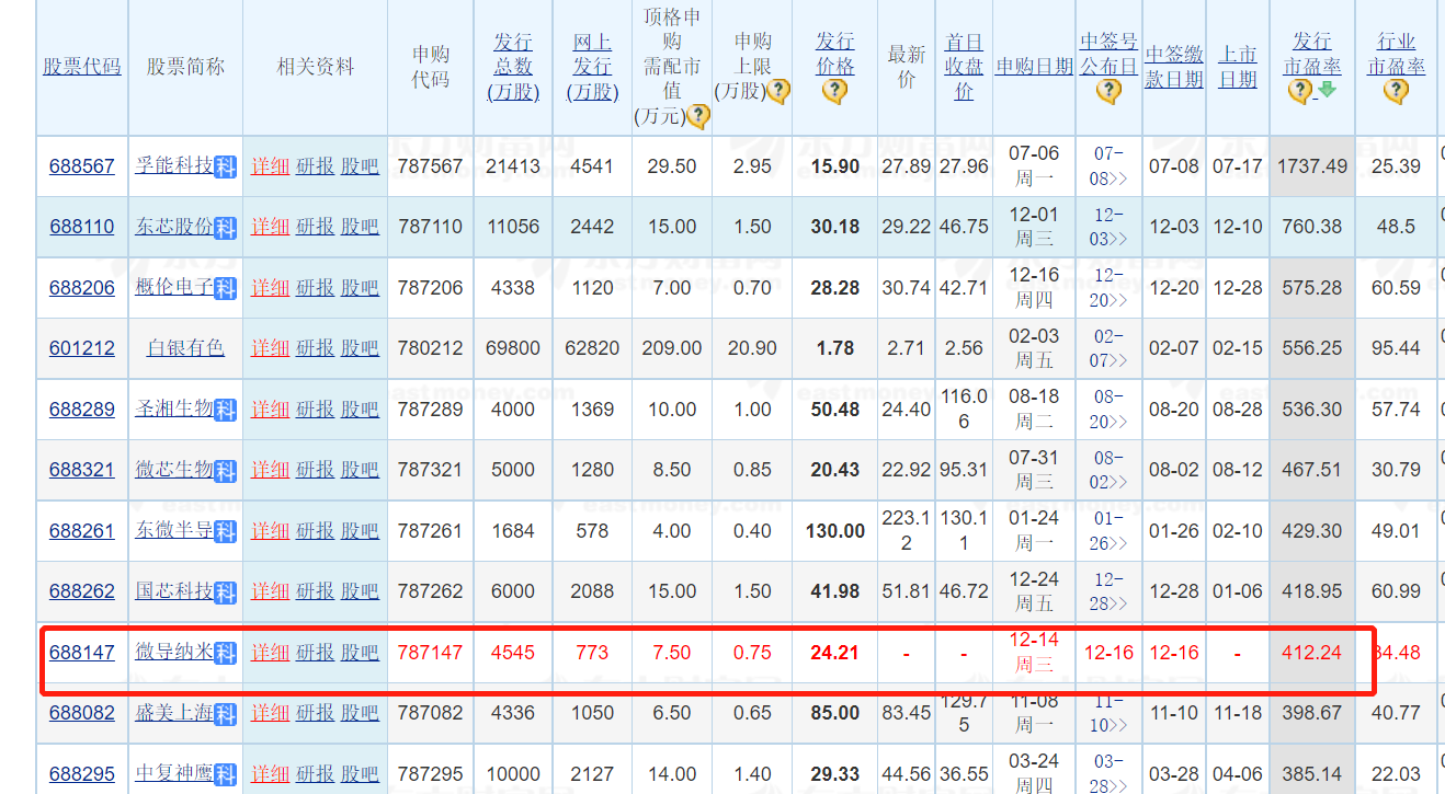 12月14日,微导纳米开启申购。公司申购代码为787147,拟公开发行股票4544.55万股,其中网上发行772.55万股,发行价格为24.21元,发行市盈率412.24倍。而该公司所在行业最近一个月平均静态市盈率为34.48倍。该公司发行市盈率为行业的11.96倍。