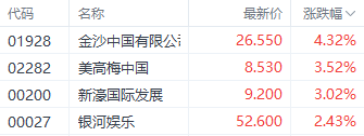 博彩股中,金沙中国(01928.HK)、美高梅中国(02282.HK)、银河娱乐(00027.HK)分别上涨4.32%、3.52%、3.02%。