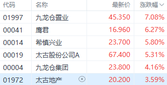 同样香港收租股受此影响上涨。截至收盘,九龙仓置业(01997.HK)、太古股份公司A(00019.HK)、九龙仓集团(00004.HK)分别上涨7.08%、5.31%、3.59%。