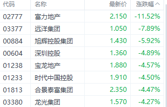 内地房地产股中,富力地产(02777.HK)、远洋集团(03377.HK)、旭辉控股集团(00884.HK)分别下跌11.52%、7.89%、5.92%。