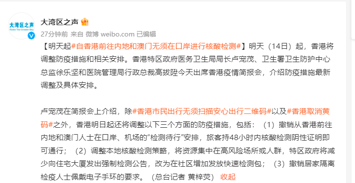 根据大湾区之声微博消息,明天(14日)起,香港将调整防疫措施和相关安排,