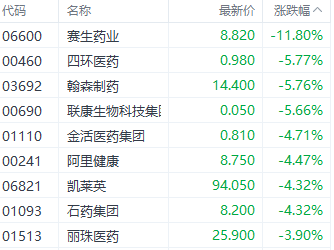 药品股中,赛生药业(06600.HK)、翰森制药(03692.HK)、丽珠医药(01513.HK)分别下跌11.80%、5.76%、3.90%。而福森药业(01652.HK)、兴科蓉医药(06833.HK)、山东新华制药(000756)(00719.HK)分别涨57.25%、17.39%、4.43%。