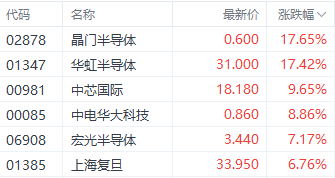 半导体股中,华虹半导体(013147.HK)、中芯国际(00981.HK)、中电华大科技(00085.HK)分别上涨17.42%、9.65%、8.86%.