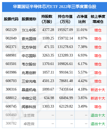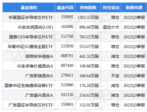 根据2022Q3季报公募基金重仓股数据,重仓该股的公募基金共56家,其中持有数量最多的公募基金为华夏国证半导体芯片ETF。华夏国证半导体芯片ETF目前规模为177.98亿元,最新净值1.0613(12月9日),较上一交易日上涨1.13%,近一年下跌37.42%。该公募基金现任基金经理为赵宗庭。赵宗庭在任的基金产品包括:华夏沪深300ETF联接A,管理时间为2017年4月17日至今,期间收益率为25.9%;华夏沪深300ETF,管理时间为2017年4月17日至今,期间收益率为26.38%;华夏野村日经225ETF,管理时间为2019年6月12日至今,期间收益率为7.05%;