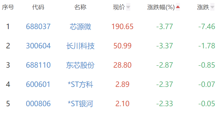 芯源微、长川科技(300604)、东芯股份、*ST方科、*ST银河位列涨幅榜后五位,涨幅分别为-3.77%、-3.37%、-2.87%、-2.37%、-2.33%。
