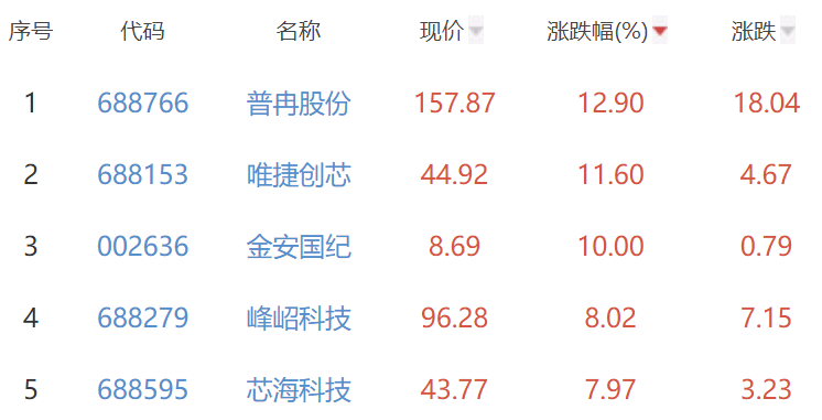 其中,普冉股份、唯捷创芯、金安国纪(002636)、峰岹科技、芯海科技位列板块涨幅前五位,涨幅分别为12.90%、11.60%、10.00%、8.02%、7.97%。