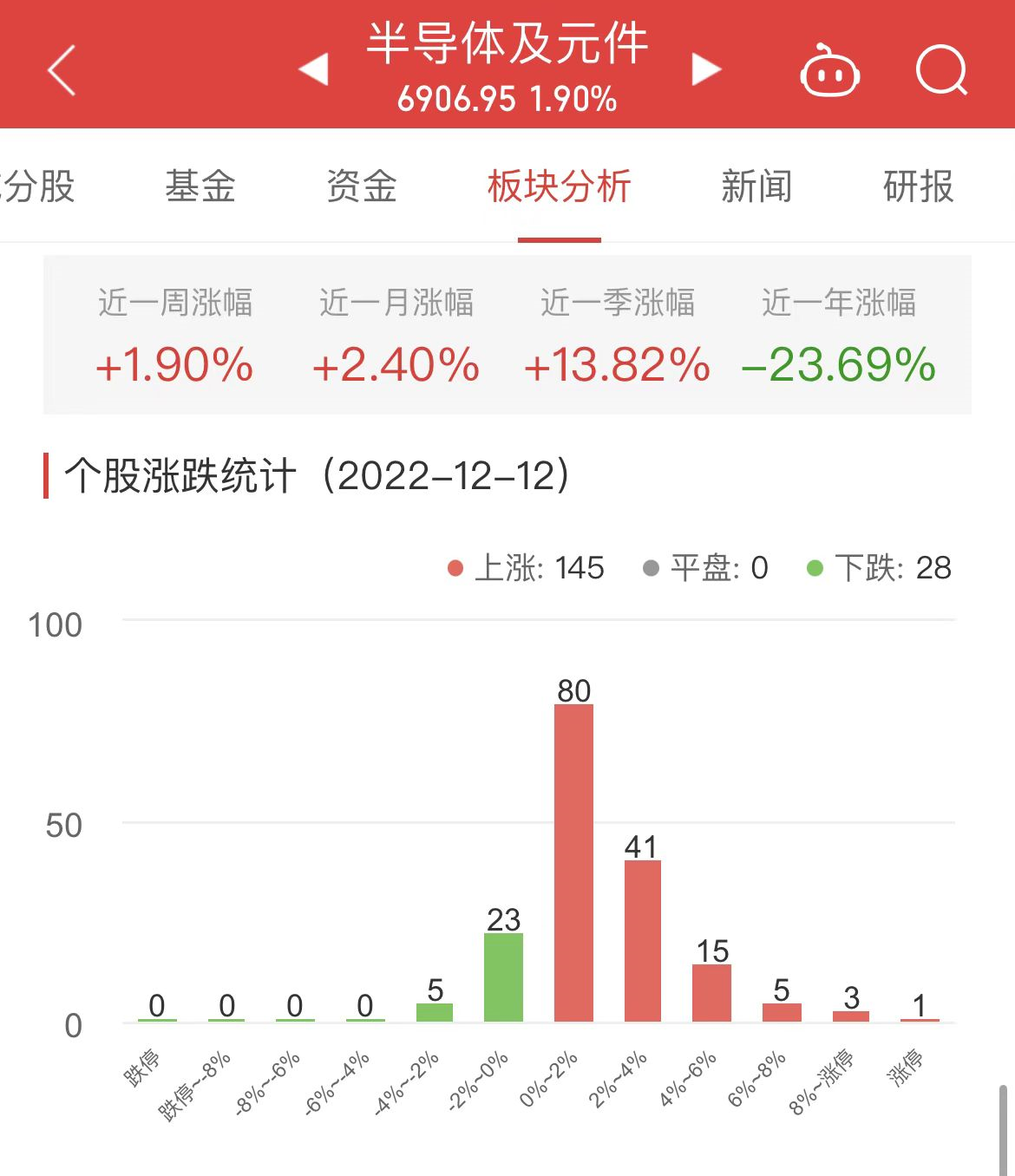 中国经济网北京12月12日讯 今日,半导体及元件板块整体涨幅1.90%,其中145只股票上涨,28只股票下跌。