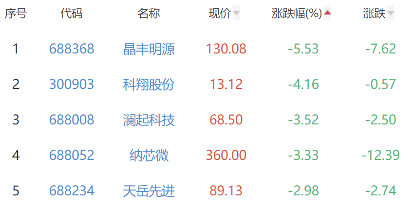 晶丰明源、科翔股份、澜起科技(688008)、纳芯微、天岳先进位列涨幅榜后五位,涨幅分别为-5.53%、-4.16%、-3.52%、-3.33%、-2.98%。