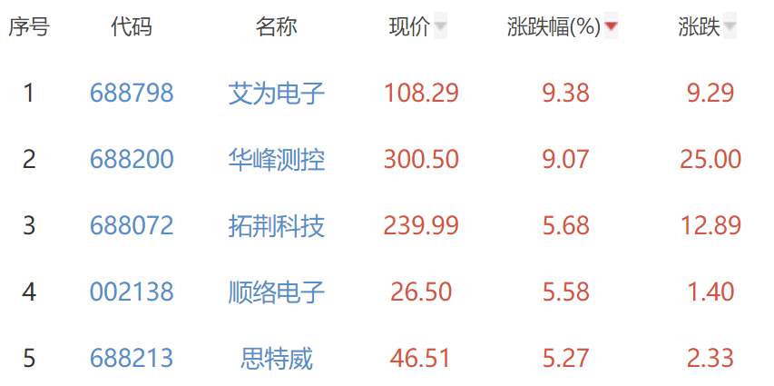 其中,艾为电子、华峰测控、拓荆科技、顺络电子(002138)、思特威位列板块涨幅前五位,涨幅分别为9.38%、9.07%、5.68%、5.58%、5.27%。