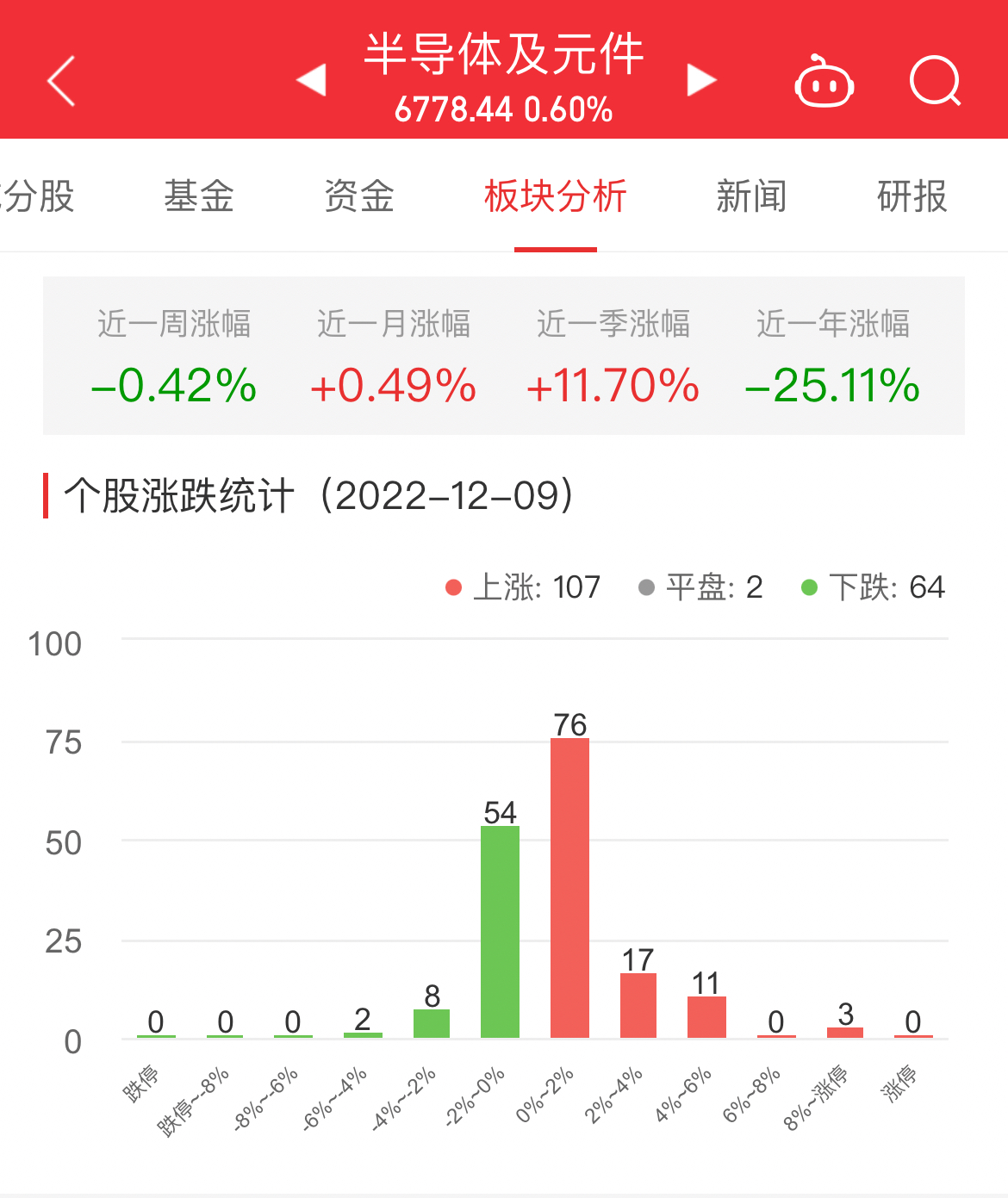 中国经济网北京12月9日讯 今日,半导体及元件板块整体涨幅0.60%,其中107只股票上涨,2只股票平盘,64只股票下跌。