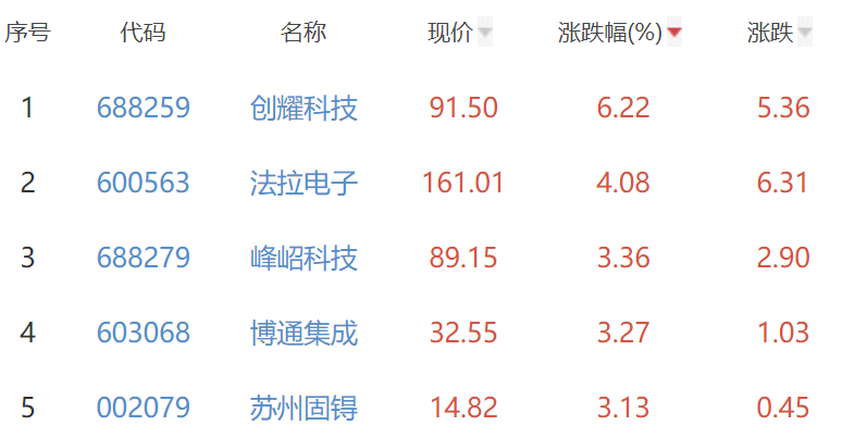 其中,创耀科技、法拉电子(600563)、峰岹科技、博通集成(603068)、苏州固锝(002079)位列板块涨幅前五位,涨幅分别为6.22%、4.08%、3.36%、3.27%、3.13%。