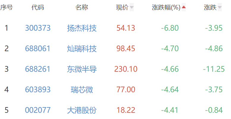 扬杰科技、灿瑞科技、东微半导、瑞芯微、大港股份(002077)位列涨幅榜后五位,涨幅分别为-6.80%、-4.70%、-4.66%、-4.64%、-4.41%。