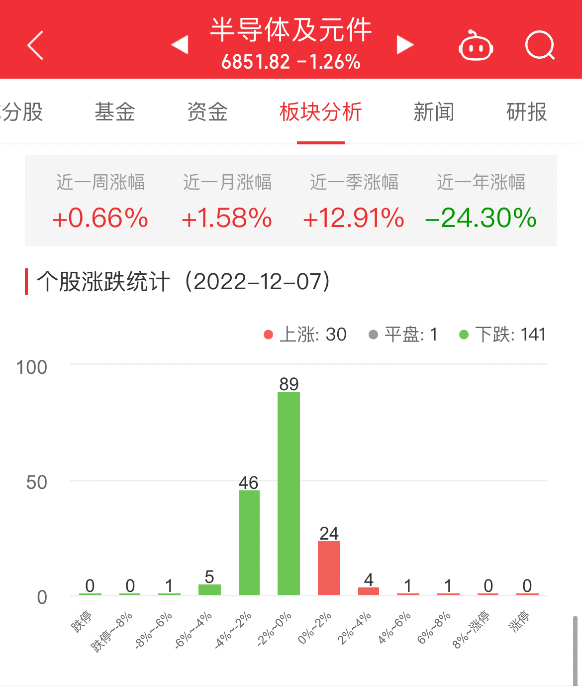 中国经济网北京12月7日讯 今日,半导体及元件板块整体跌幅1.26%,其中30只股票上涨,1只股票平盘,141只股票下跌。