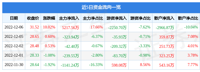 12月6日的资金流向数据方面,主力资金净流入5217.56万元,占总成交额17.66%,游资资金净流出2250.7万元,占总成交额7.62%,散户资金净流出2966.87万元,占总成交额10.04%。
