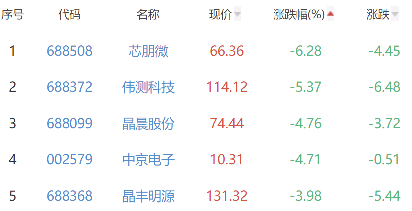 芯朋微、伟测科技、晶晨股份(688099)、中京电子(002579)、晶丰明源位列涨幅榜后五位,涨幅分别为-6.28%、-5.37%、-4.76%、-4.71%、-3.98%。