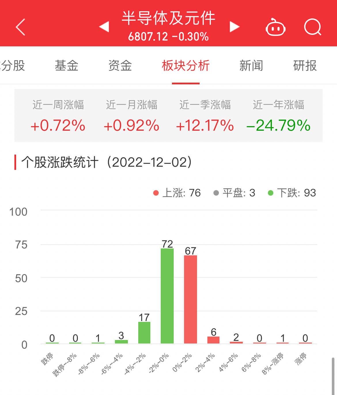 中国经济网北京12月2日讯 今日,半导体及元件板块整体跌幅0.30%,其中76只股票上涨,3只股票平盘,93只股票下跌。