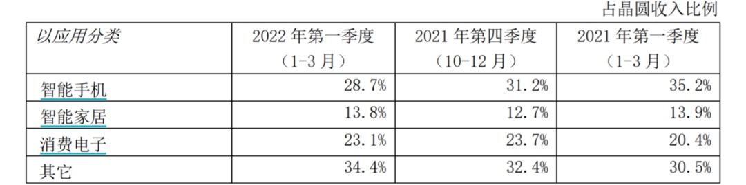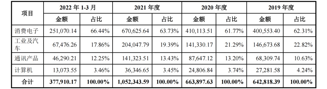 截至2022第一季度,其产品主要应用于消费电子、工业及汽车、通讯产品及计算机领域,其中消费电子占比最高,报告期各期占比均达到六成以上。