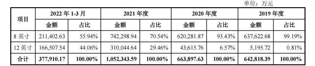 更强劲的增长动力来自于2019年四季度开始投产的12英寸产线,报告期内相关收入分别为5195.72万元、4.36亿元、31亿元和16.65亿元,近三年的复合增长率达672.48%。