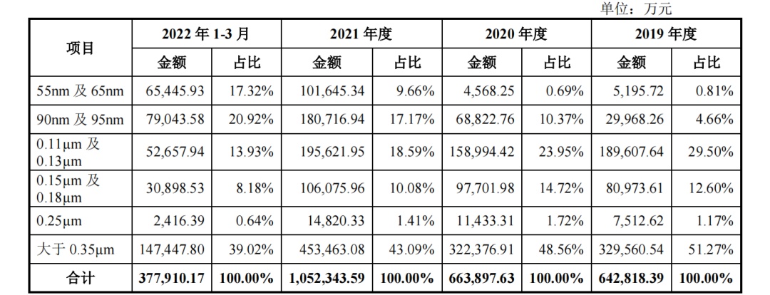 但报告期内,其收入仍以大于0.35?m的工艺节点为主,55nm及65nm占比分别为0.81%、0.69%、9.66%及17.32%。