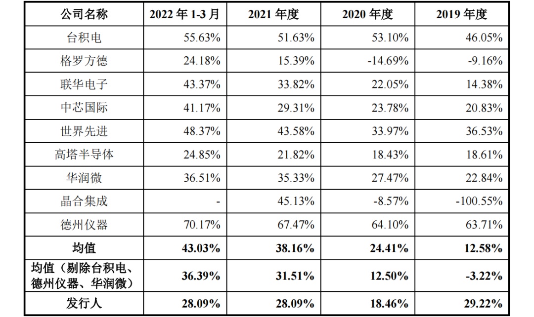 没有先进制程工艺的华虹半导体只能赚点“辛苦钱”。2019年-2021年及2022年1-3月(以下简称“报告期内”),华虹半导体的毛利率分别为29.22%、18.46%、28.09%、28.09%,而同期,除了2019年由于晶合集成毛利率过低导致平均值较低外,行业可比公司毛利率均值均高于华虹半导体。