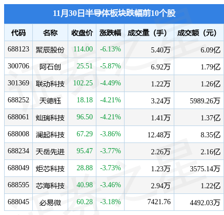 11月30日半导体板块较上一交易日下跌0.27%,聚辰股份领跌。当日上证指数报收于3151.34,上涨0.05%。深证成指报收于11108.5,上涨0.18%。半导体板块个股涨跌见下表: