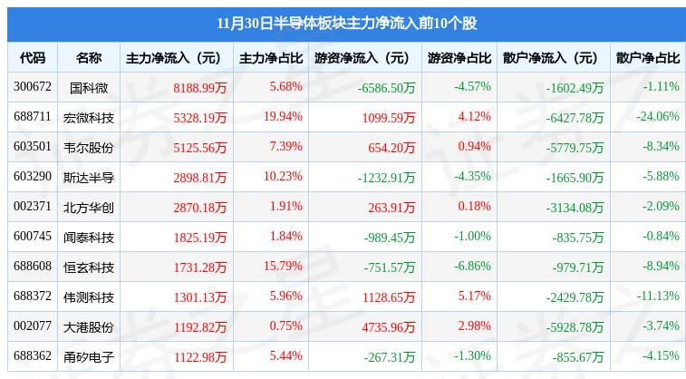 从资金流向上来看,当日半导体板块主力资金净流出6.96亿元,游资资金净流入4.91亿元,散户资金净流入2.04亿元。半导体板块个股资金流向见下表: