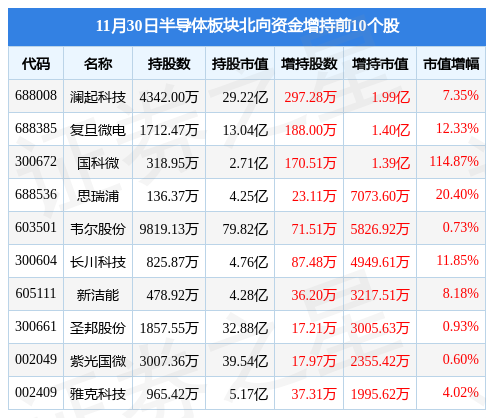 北向资金方面,当日半导体板块北向资金持股市值为550.28亿元,增持4.58亿元。其中增持最多的是澜起科技(688008),增持了1.99亿元。减持持最多的是北方华创(002371),减持了0.84亿元。半导体板块北向资金持股变动明细见下表: