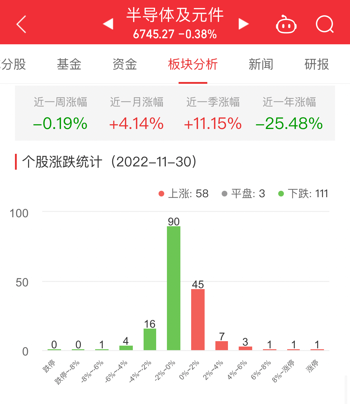 中国经济网北京11月30日讯 今日,半导体及元件板块整体跌幅0.38%,其中58只股票上涨,3只股票平盘,111只股票下跌。