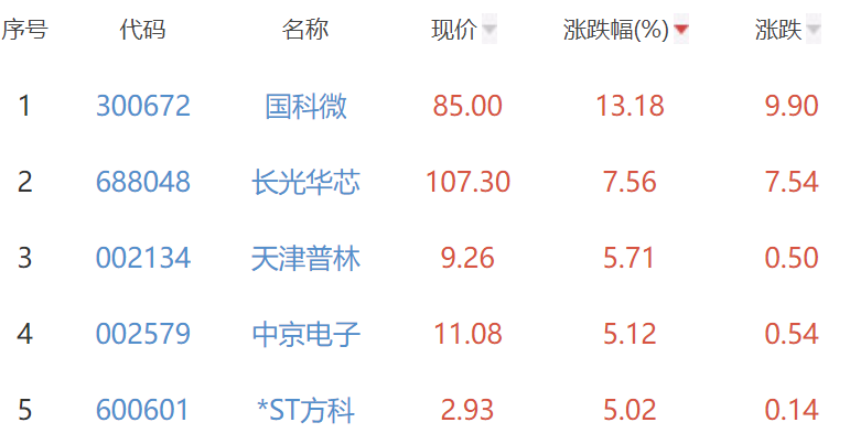 其中,国科微(300672)、长光华芯、天津普林(002134)、中京电子(002579)、*ST方科位列板块涨幅前五位,涨幅分别为13.18%、7.56%、5.71%、5.12%、5.02%。