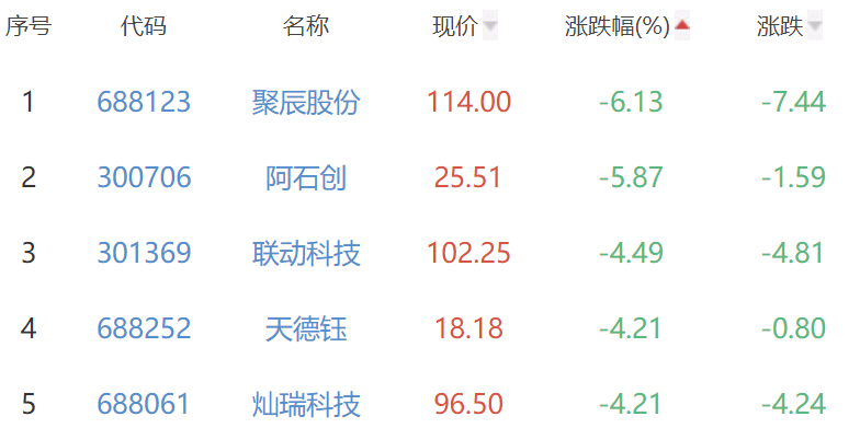 聚辰股份、阿石创(300706)、联动科技、天德钰、灿瑞科技位列涨幅榜后五位,涨幅分别为-6.13%、-5.87%、-4.49%、-4.21%、-4.21%。