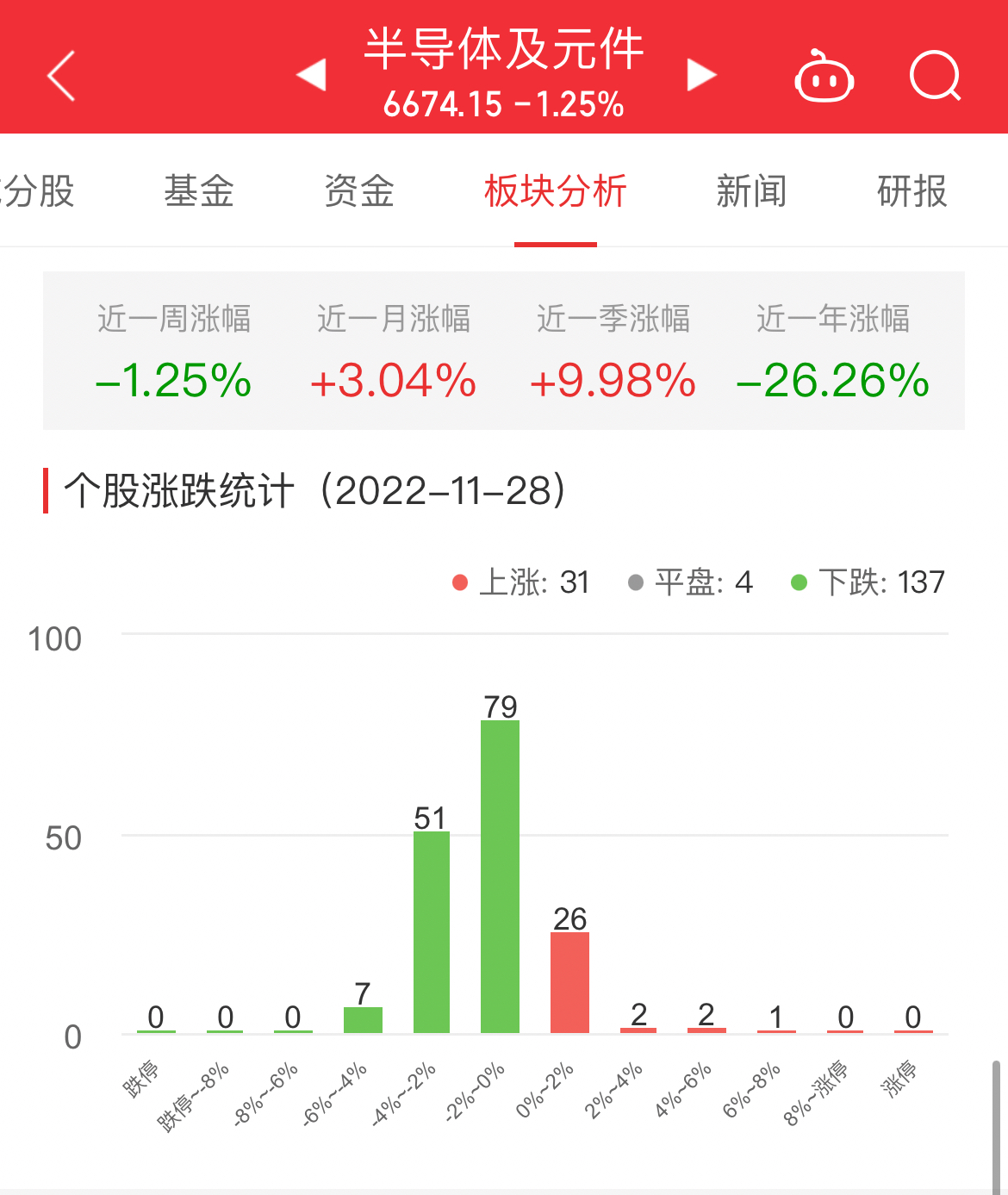 中国经济网北京11月28日讯 今日,半导体及元件板块整体跌幅1.25%,其中31只股票上涨,4只股票平盘,137只股票下跌。