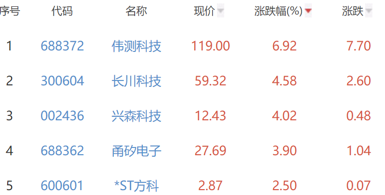 其中,伟测科技、长川科技(300604)、兴森科技(002436)、甬矽电子、*ST方科位列板块涨幅前五位,涨幅分别为6.92%、4.58%、4.02%、3.90%、2.50%。