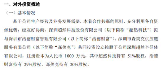 挖贝网11月23日,超然科技(838951)近日发布公告,基于公司生产经营及业务发展需要,本着合作共赢的原则,充分利用各自资源优势,经友好协商,深圳超然科技股份有限公司(以下简称“超然科技”)拟与深圳市浩德财富管理有限公司(以下简称“浩德财富”)、深圳市森美克供应链服务有限公司(以下简称“森美克”)共同投资设立控股子公司深圳超然半导体有限公司,注册资本为人民币1000万元,其中超然科技投资510万,持有51%股权,浩德财富投资290万,持有29%股权,森美克投资200万,持有20%股权。
