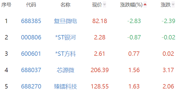 复旦微电、*ST银河、*ST方科、芯源微、臻镭科技位列涨幅榜后五位,涨幅分别为-2.83%、-0.87%、0.77%、1.56%、1.63%。