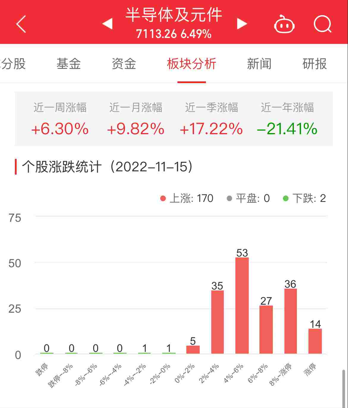 中国经济网北京11月15日讯 今日,半导体及元件板块整体涨幅6.49%,其中170只股票上涨,2只股票下跌。