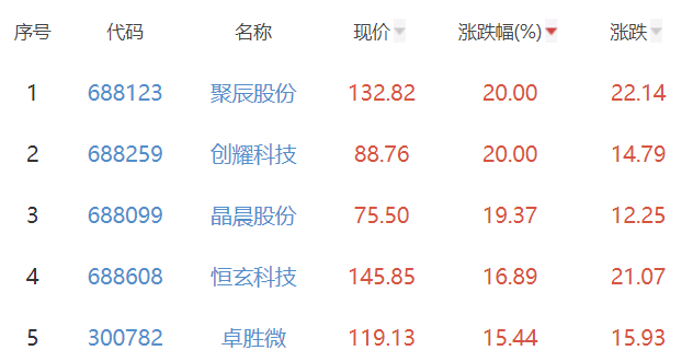 其中,聚辰股份、创耀科技、晶晨股份(688099)、恒玄科技、卓胜微(300782)位列板块涨幅前五位,涨幅分别为20.00%、20.00%、19.37%、16.89%、15.44%。