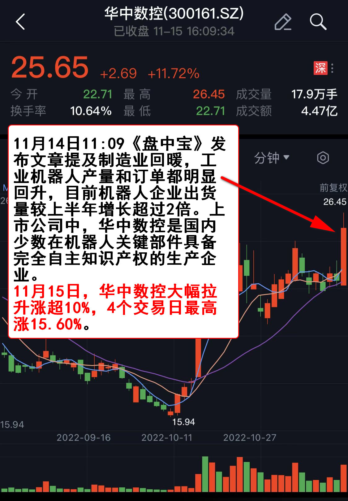 11月15日,华中数控大幅拉升涨超10%,4个交易日最高涨15.60%。