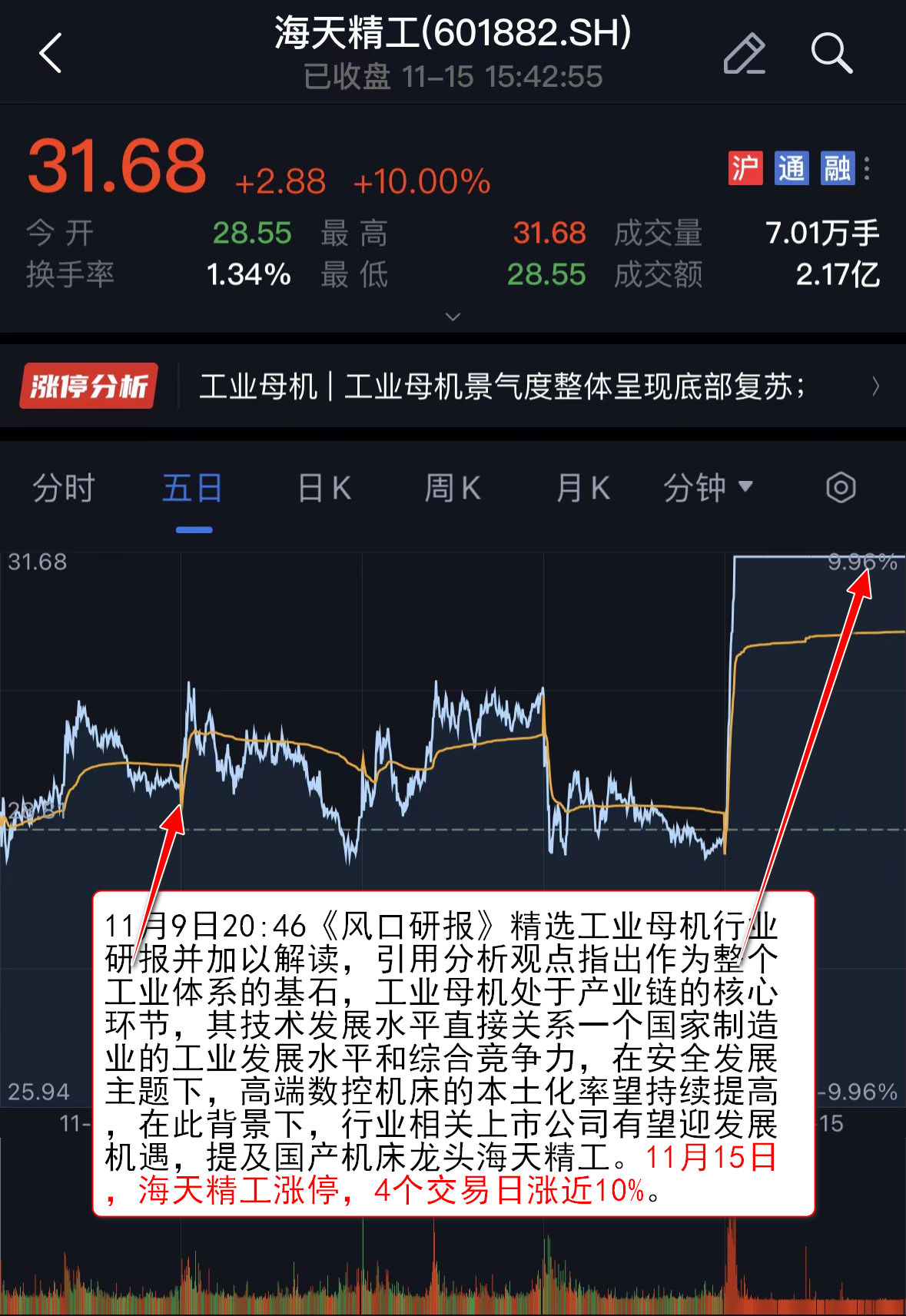 11月9日20:46《风口研报》精选工业母机行业研报并加以解读,引用分析观点指出作为整个工业体系的基石,工业母机处于产业链的核心环节,其技术发展水平直接关系一个国家制造业的工业发展水平和综合竞争力,在安全发展主题下,高端数控机床的本土化率望持续提高,在此背景下,行业相关上市公司有望迎发展机遇,提及国产机床龙头海天精工(601882)。11月15日,海天精工涨停,4个交易日涨近10%。