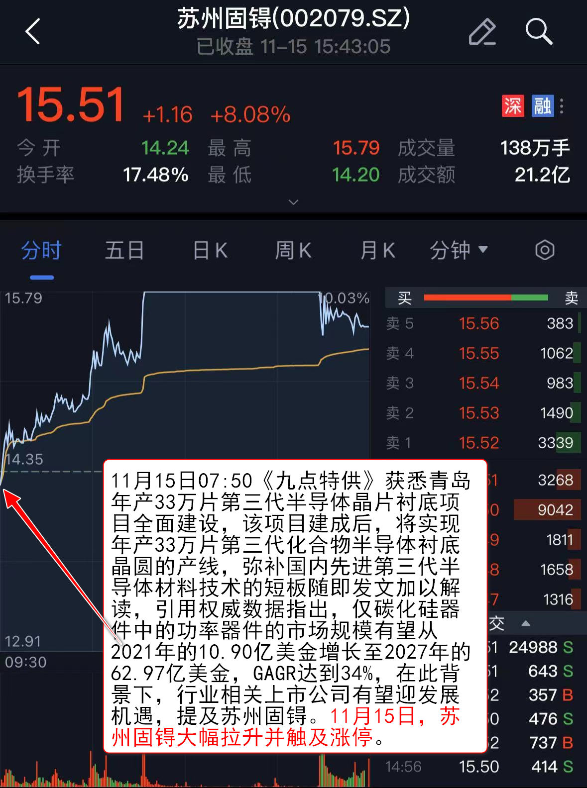 11月15日07:50《九点特供》获悉青岛年产33万片第三代半导体晶片衬底项目全面建设,该项目建成后,将实现年产33万片第三代化合物半导体衬底晶圆的产线,弥补国内先进第三代半导体材料技术的短板,随即发文加以解读,引用权威数据指出,仅碳化硅器件中的功率器件的市场规模有望从2021年的10.90亿美金增长至2027年的62.97亿美金,GAGR达到34%,在此背景下,行业相关上市公司有望迎发展机遇,提及苏州固锝(002079)。11月15日,苏州固锝大幅拉升并触及涨停。