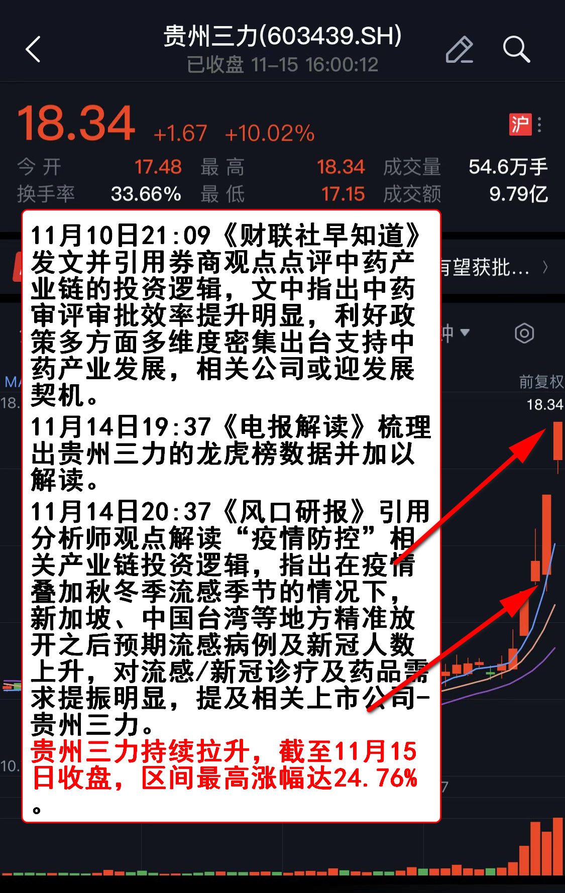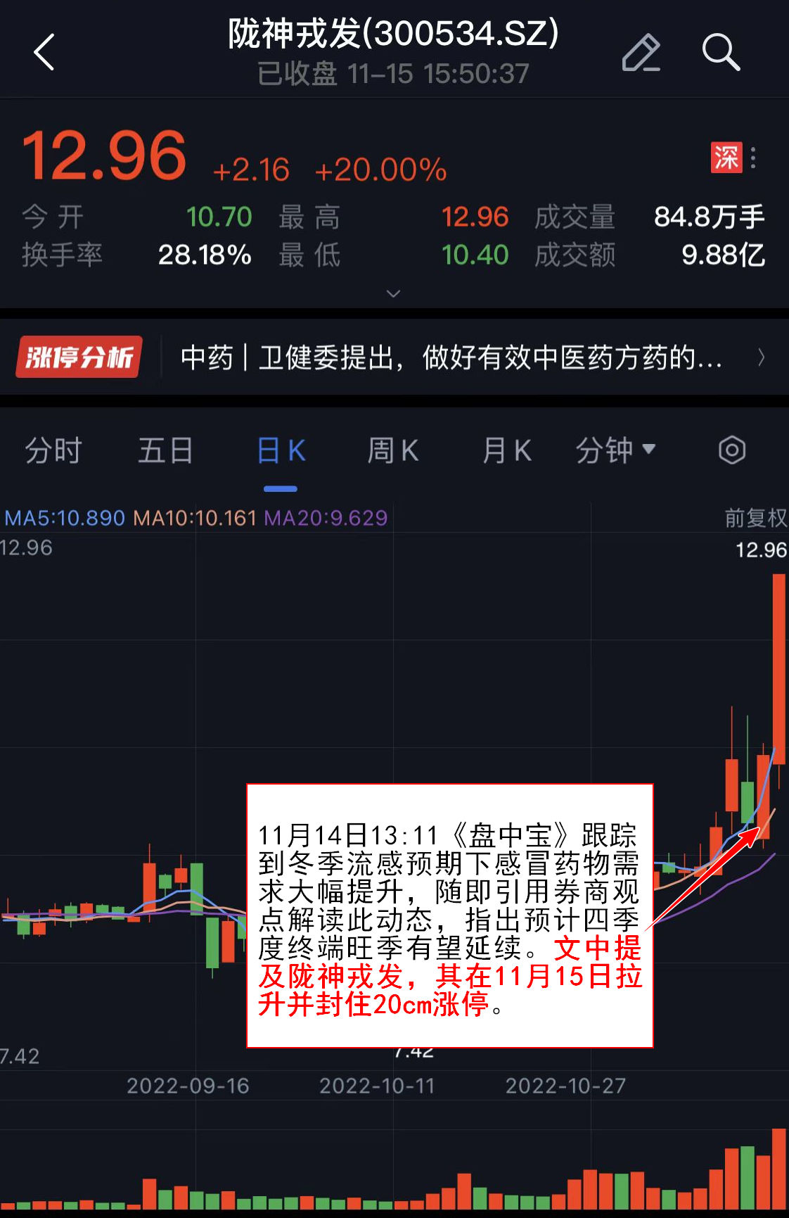 11月14日13:11《盘中宝》跟踪到冬季流感预期下感冒药物需求大幅提升,随即引用券商观点解读此动态,指出预计四季度终端旺季有望延续。文中提及陇神戎发(300534),其在11月15日拉升并封住20cm涨停。