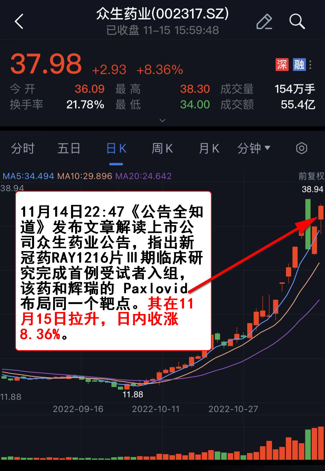 11月14日22:47《公告全知道》发布文章解读上市公司众生药业(002317)公告,指出新冠药RAY1216片Ⅲ期临床研究完成首例受试者入组,该药和辉瑞的 Paxlovid 布局同一个靶点。其在11月15日拉升,日内收涨8.36%。