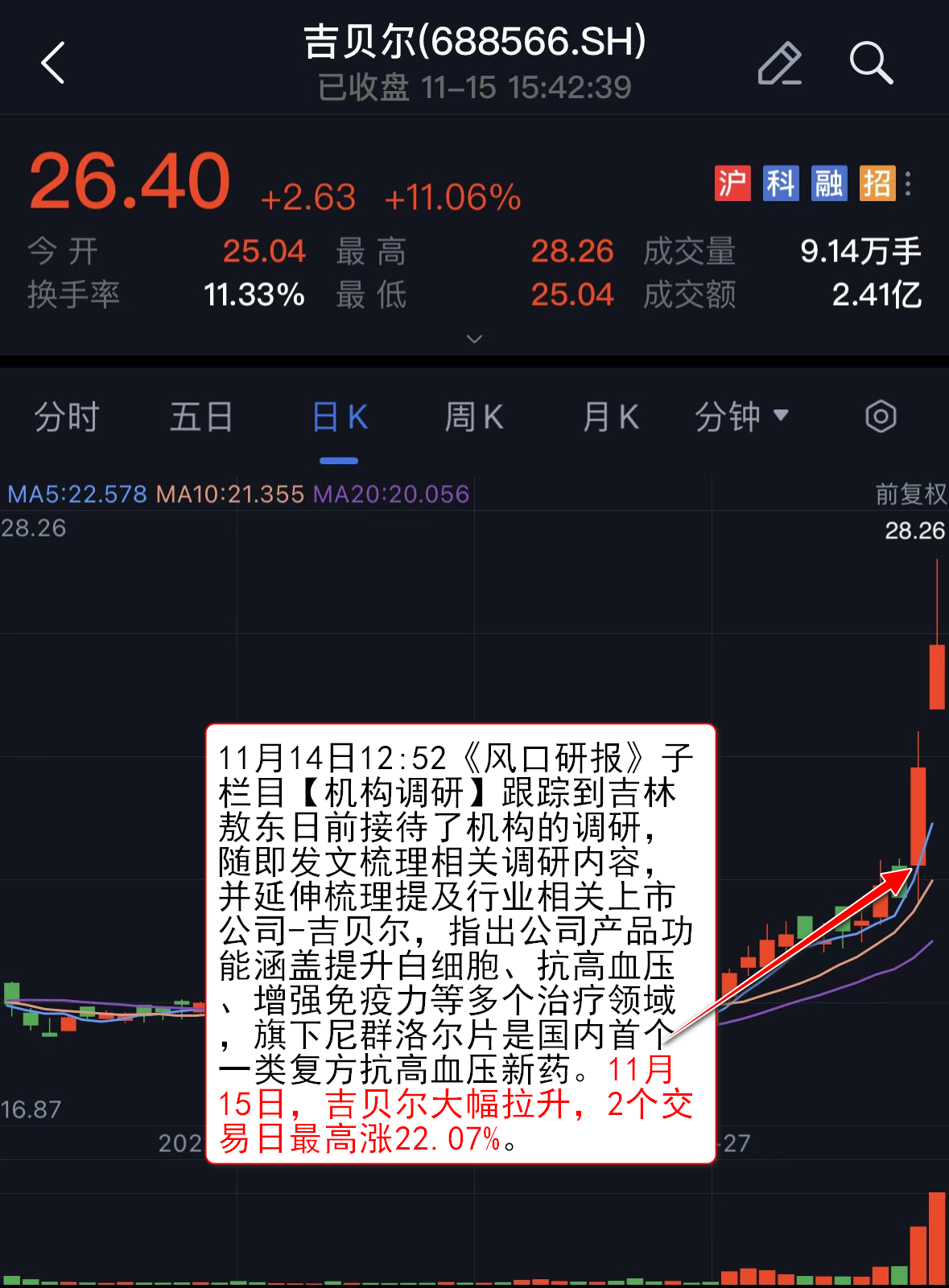 11月14日12:52《风口研报》子栏目【机构调研】跟踪到吉林敖东(000623)日前接待了机构的调研,随即发文梳理相关调研内容,并延伸梳理提及行业相关上市公司-吉贝尔,指出公司产品功能涵盖提升白细胞、抗高血压、增强免疫力等多个治疗领域,旗下尼群洛尔片是国内首个一类复方抗高血压新药。11月15日,吉贝尔大幅拉升,2个交易日最高涨22.07%。